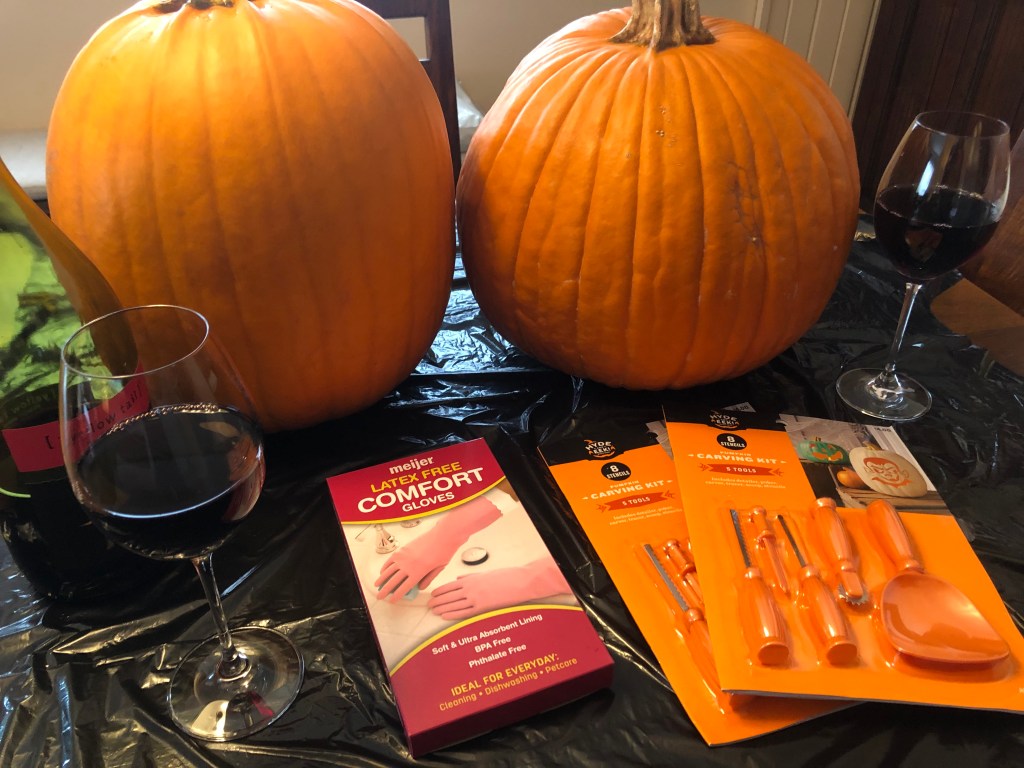 So… My husband, Rick, didn’t laugh at me when I told him I bought some pumpkins but he did give me “that smile” – the same one I got when I told him I’m painting the front door hot pink. It’s a cross between “what the-?” and “I’m not sure how to feel about this but I’m going along because I know it’ll make you happy.” Isn’t he a sweetie-pie? I really appreciate that smile. Really, really. Anyway, wine was definitely needed for this project so we happily had a couple of glasses before we tackled Project: Halloween Cheer. Here’s how it all went down…