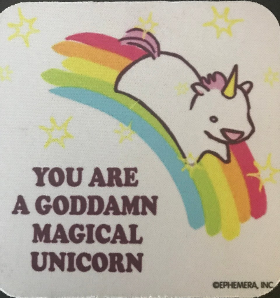 Unicorn stuff around the house… I do not claim to be a fan of unicorns. No one in our house would. When I see or think of them, I think of hokey little girlie animals that shoot skittles and glitter out of their butts. Nothing ever to be serious about. I certainly don’t collect them, and I don’t intentionally buy them for myself. But my sister and I have been exchanging unicorn stuff on special occasions ever since we discovered these awesome coasters while shopping together. It just cracked us up! Since then, we’ll give each other hokey unicorn stuff to cheer each other up. Feelin’ the magic of the unicorn! A silly-sweet inside joke between the two of us. I love ya sis!